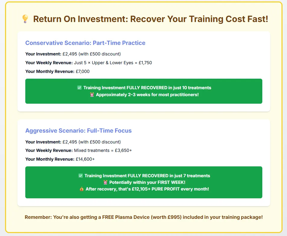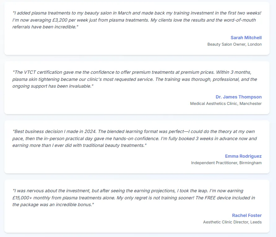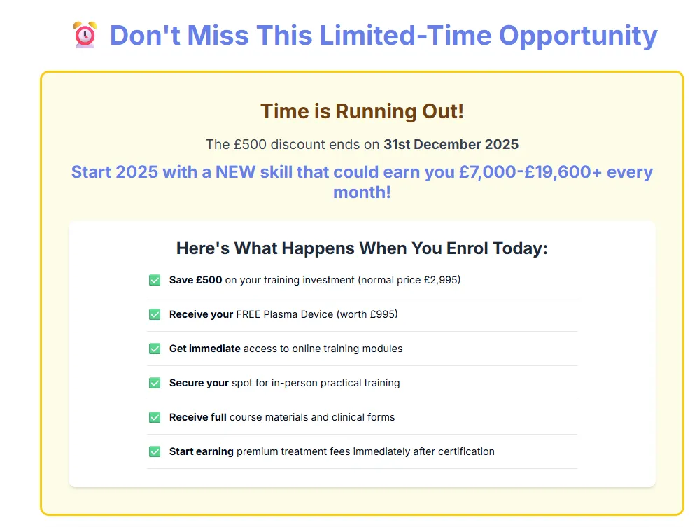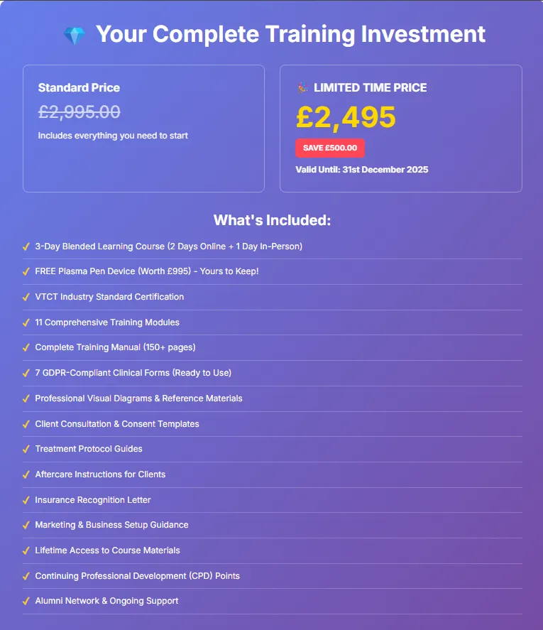 Plasma skin tightening is the fastest-growing aesthetic treatment in the UK beauty industry. Clients are willing to pay premium prices for this revolutionary non-surgical facelift alternative. Our VTCT-certified 3-day training course gives you everything you need to start offering these high-ticket treatments and dramatically increase your revenue.